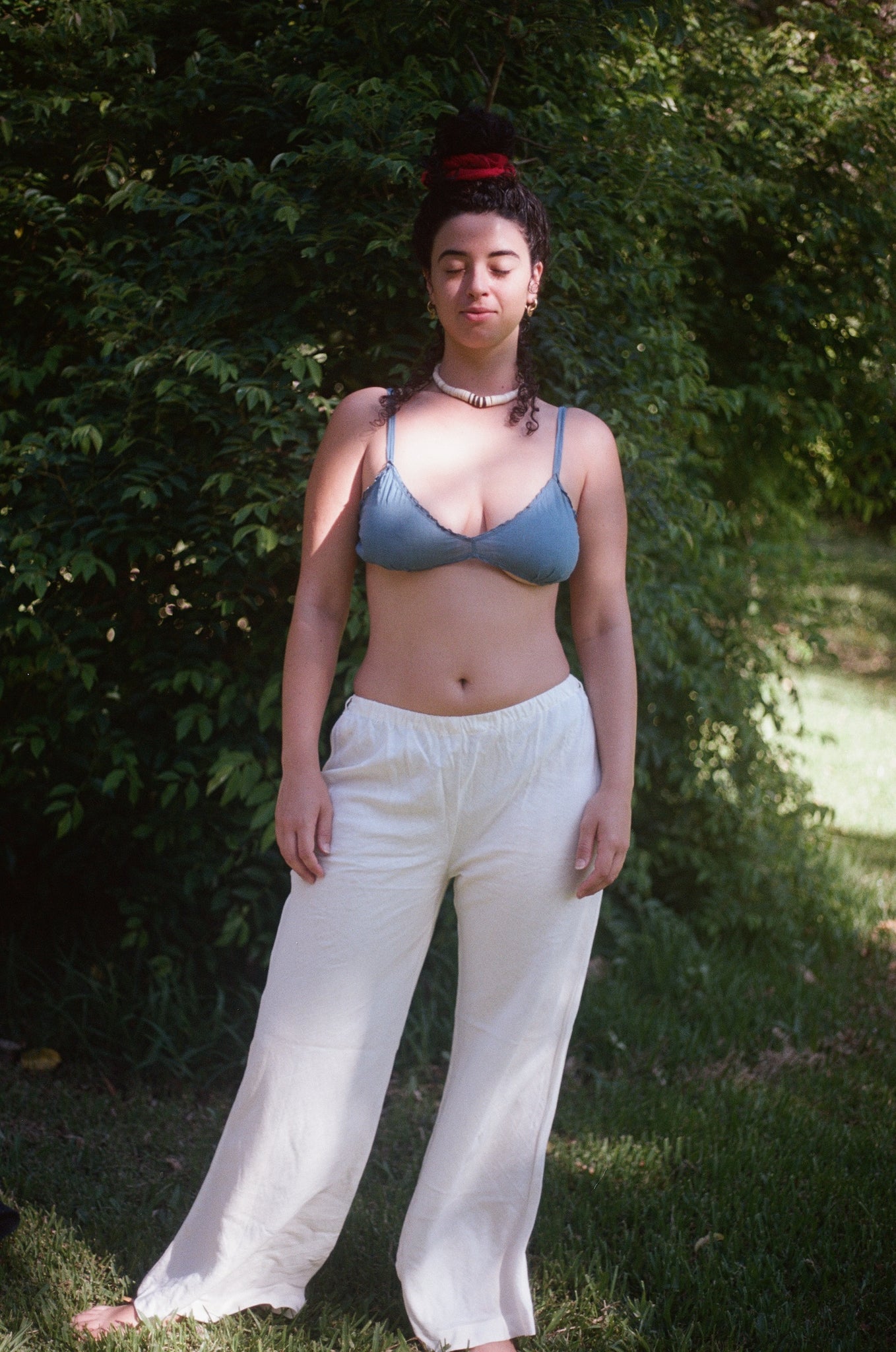 Cotton Bra botanically dyed in an Olive green as seen on the blonde model in the photos, Chocolate Brown and Indigo Blue