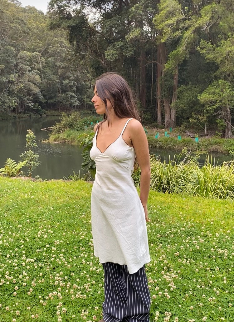 This dress is a mixed fabric of Cotton and Linen. The brunette is wearing an Xs and the blonde is wearing an S. The Olive green Color in the photo is a size M.